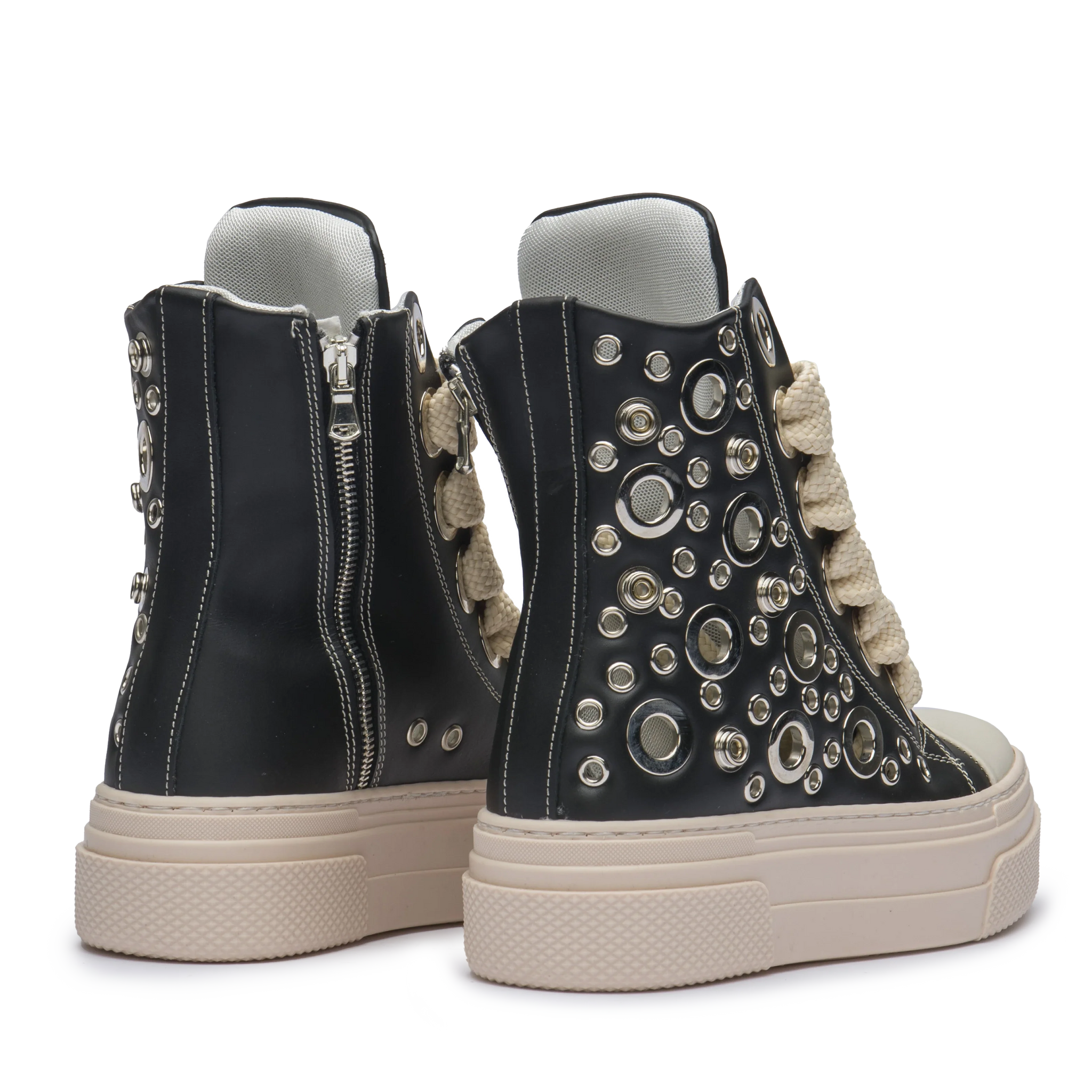Combina pelle nera con dettagli argento a contrasto e lacci in cotone color crema. Un design pensato per dominare la scena urbana con forza e stile, esaltando l'attitudine strada di lusso di CR03.