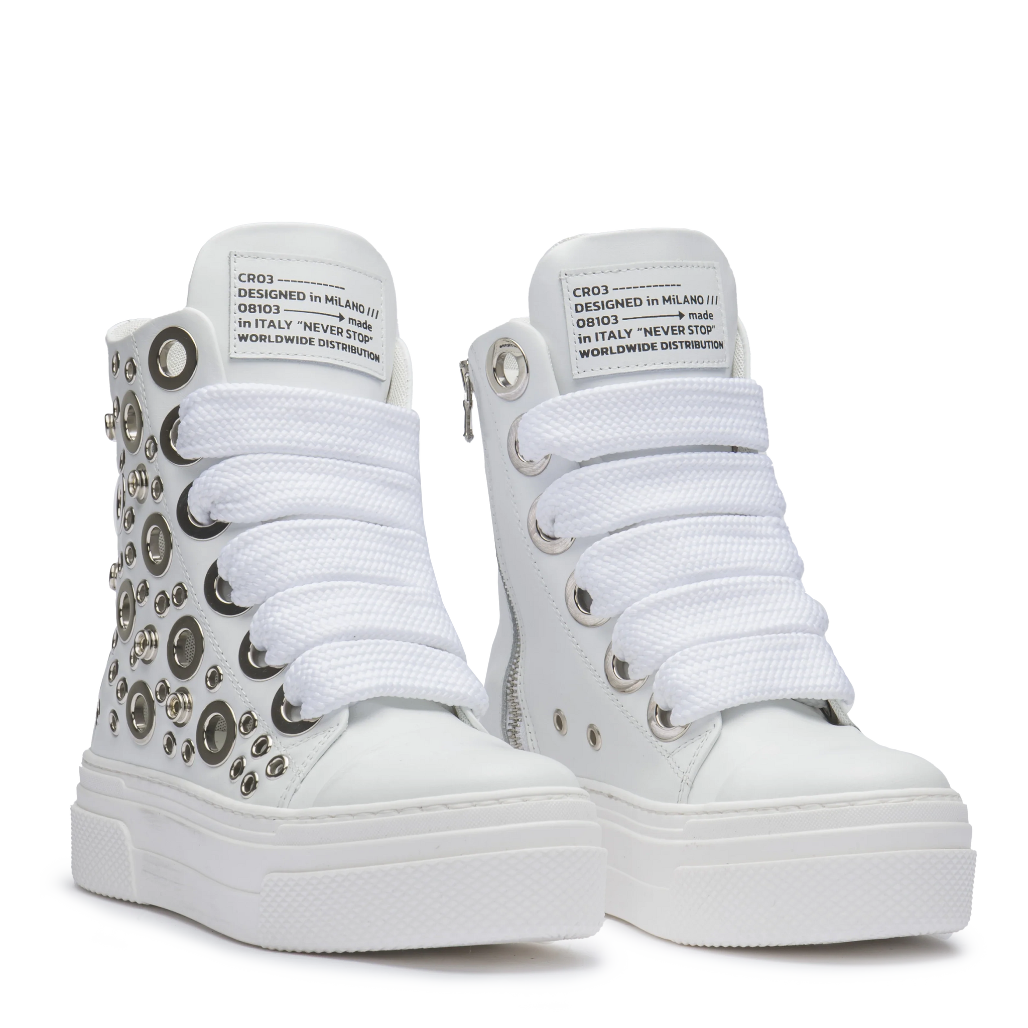 Accende ogni look con la sua pelle bianca lucida, traforata da maxi occhielli argento che riflettono la luce a ogni passo. Le maxi stringhe intrecciate in cotone completo una sneaker d'impatto, dal carattere deciso e totale Made in Italy.