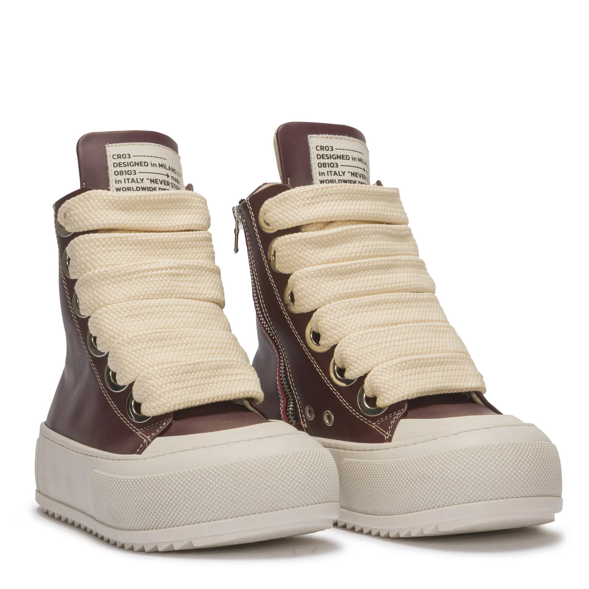 Combina la suola architettonica CR03 con una tomaia in morbida pelle italiana in bordeaux intenso. I lacci color crema oversize aggiungono un tocco di stile, bilanciando il volume della strada e i materiali raffinati.