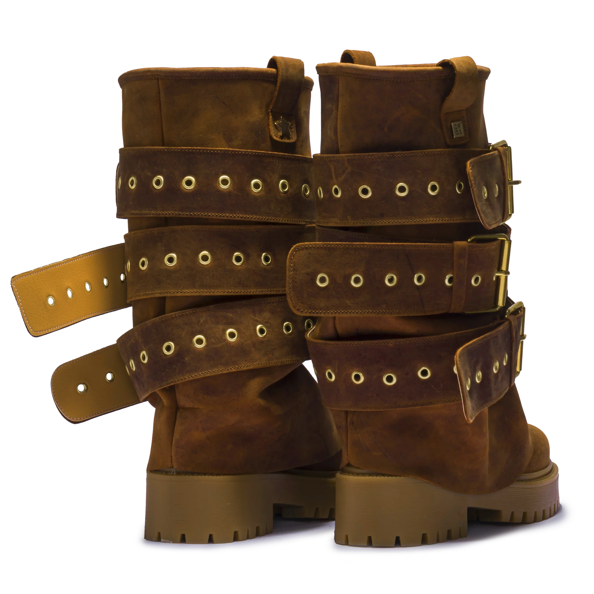 Incarna l'identità grezza con un potente mix di struttura e libertà. Le fibbie dorate oversize e i numerosi cinturini definiscono un design ribelle, mentre il ricco nabuk marrone ammorbidisce il look con consistenza e profondità. La suola tonale spessa aggiunge peso, equilibrio e una presenza inconfondibile.