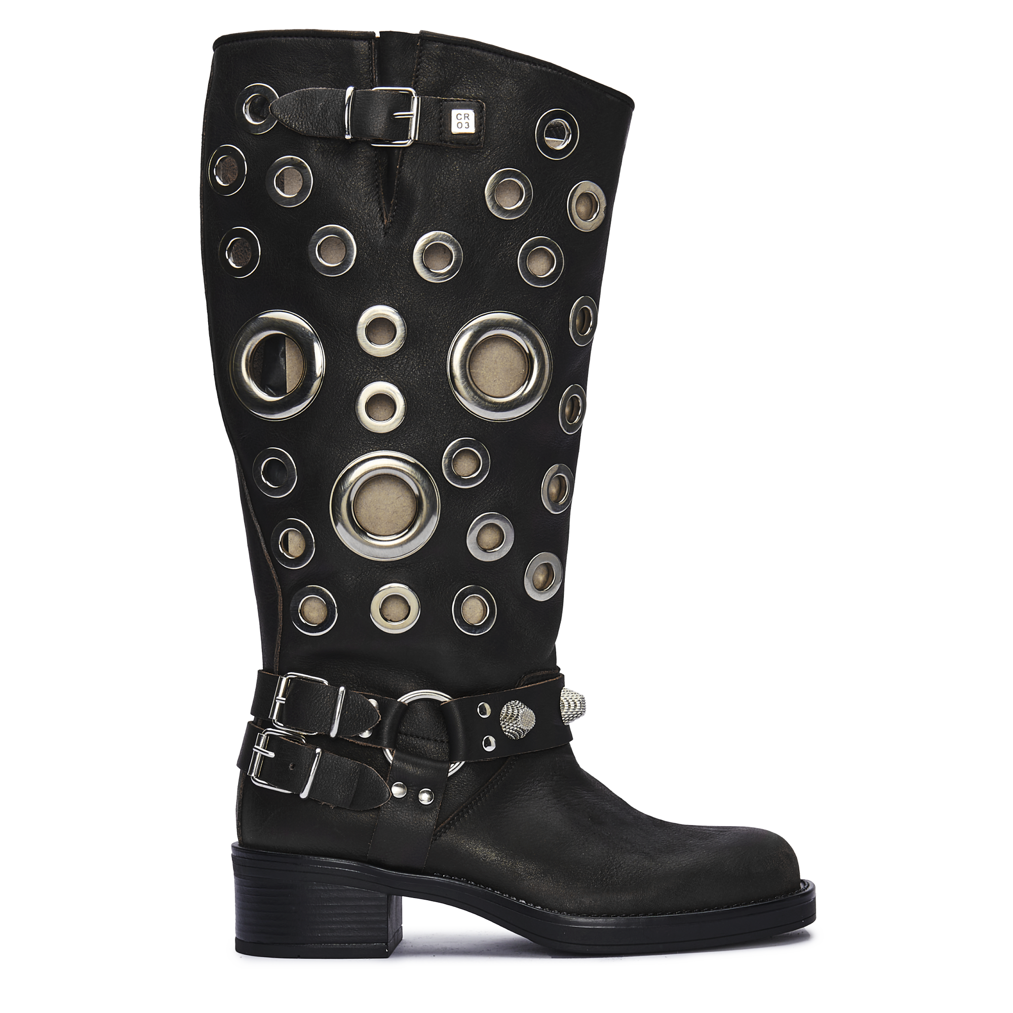 A bold knee-high boot crafted in premium black leather, defined by industrial metal eyelets and structured harness detailing.