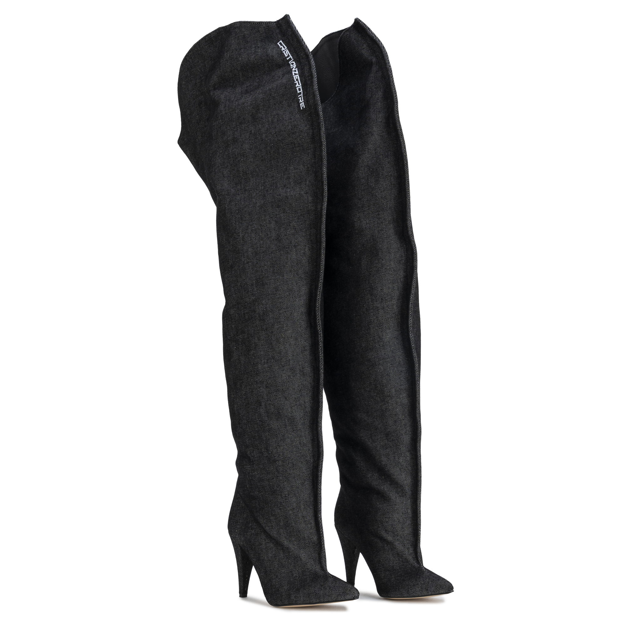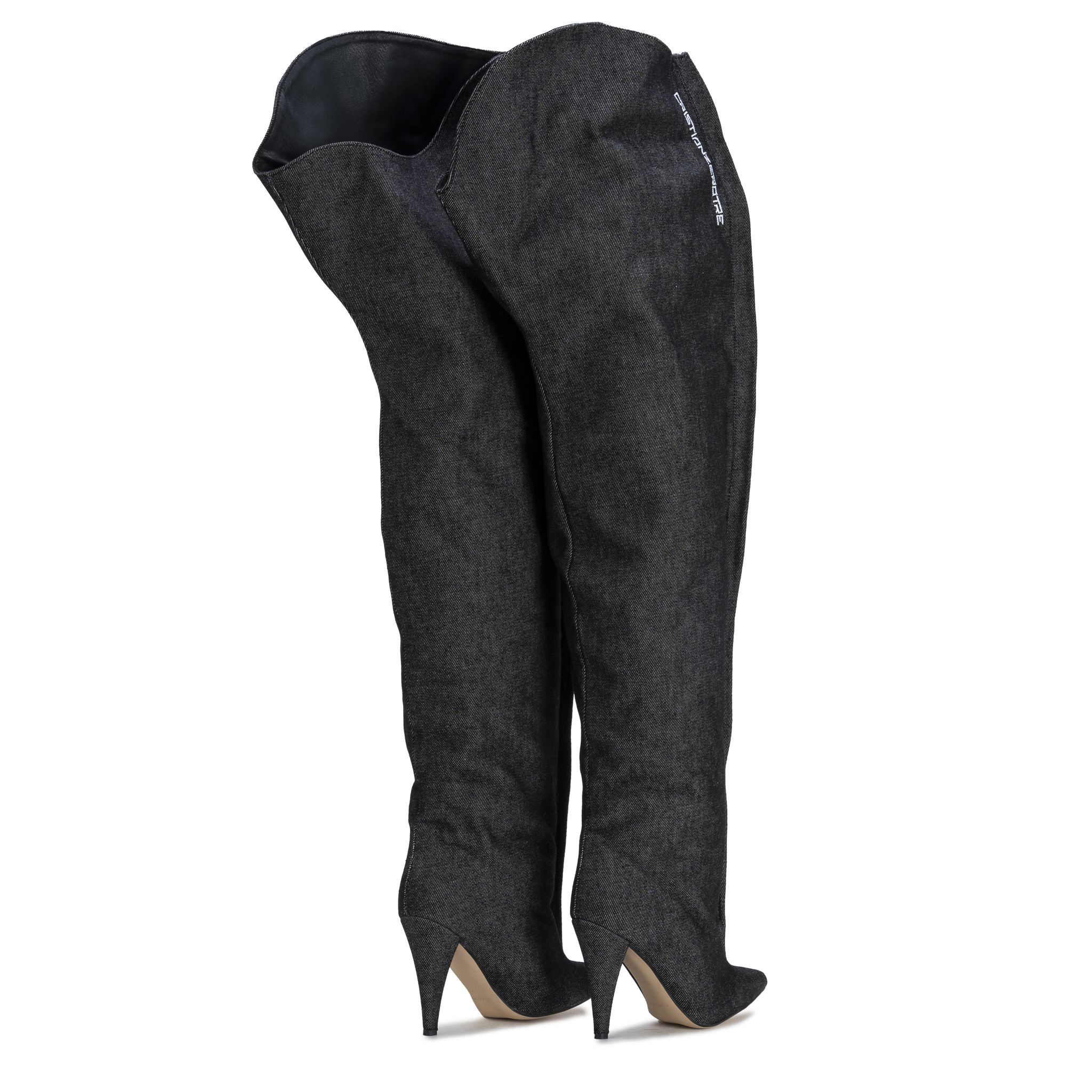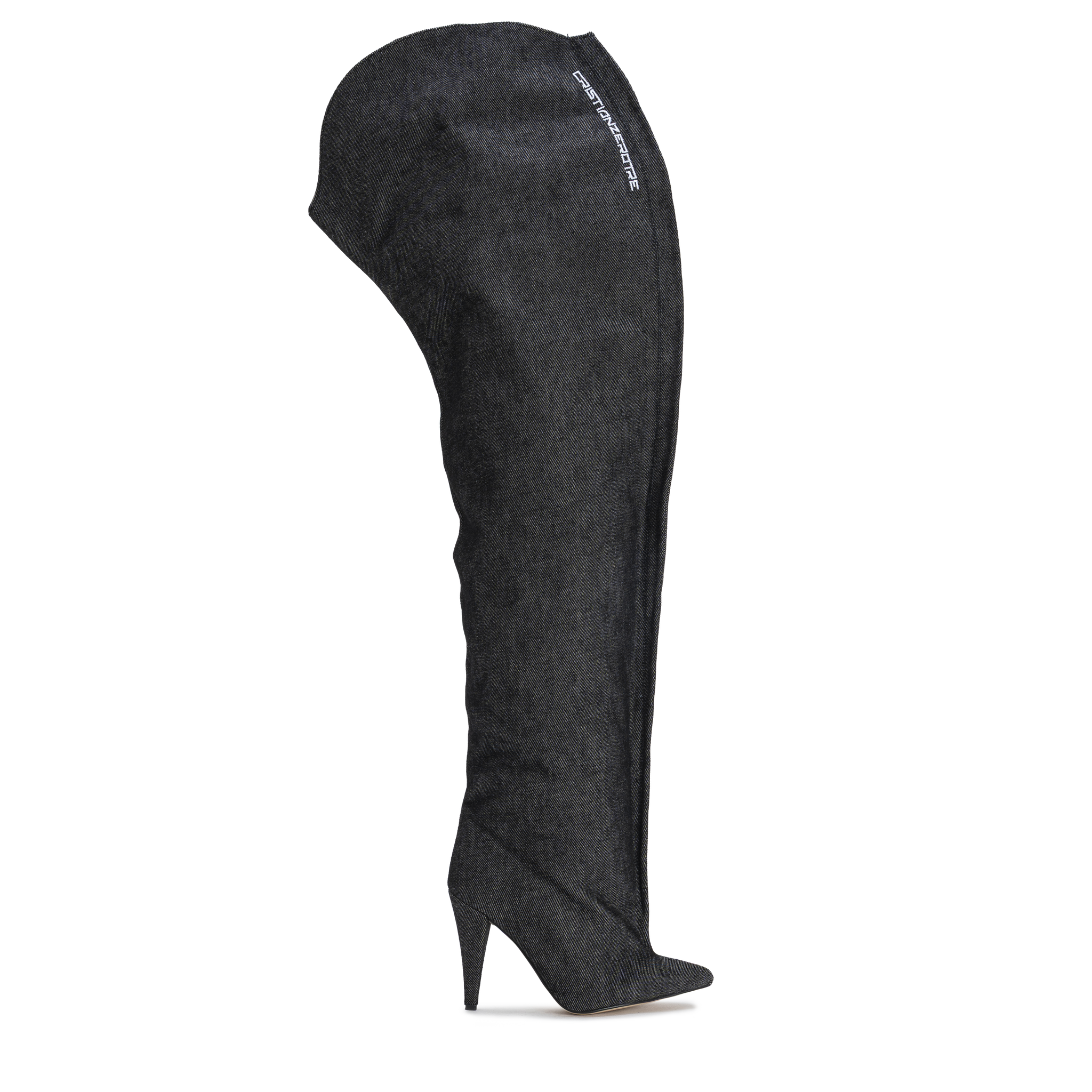 A sleek over-the-knee boot crafted in washed grey denim, defined by its fluid silhouette and natural movement.