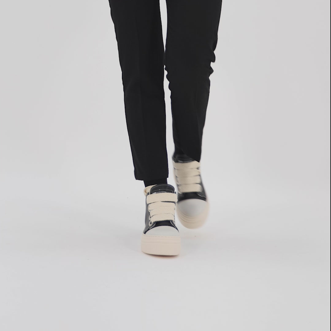 Mix of simplicity and modernity that will satisfy all your needs! Only in our brand you will find the solid plateau that supports the entire black leather structure. They are decorated with a maxi cream-colored lace.